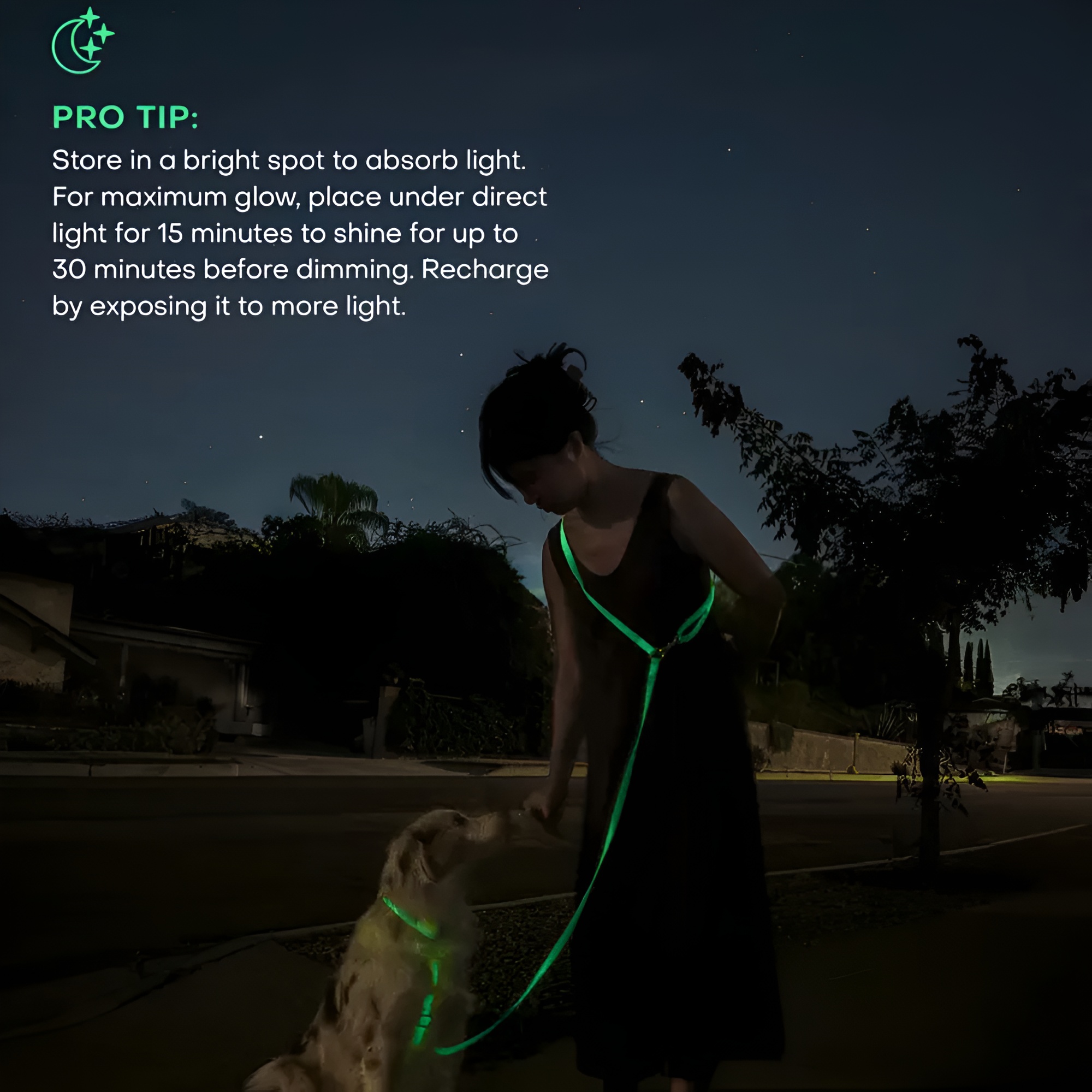 The glow element within the Glow Dark Waterproof Collar responds to natural and artificial light. For stronger brightness, position the collar in a well lit area before use. A fifteen-minute exposure allows up to thirty minutes of visible glow before dimming. Recharging requires only light exposure.