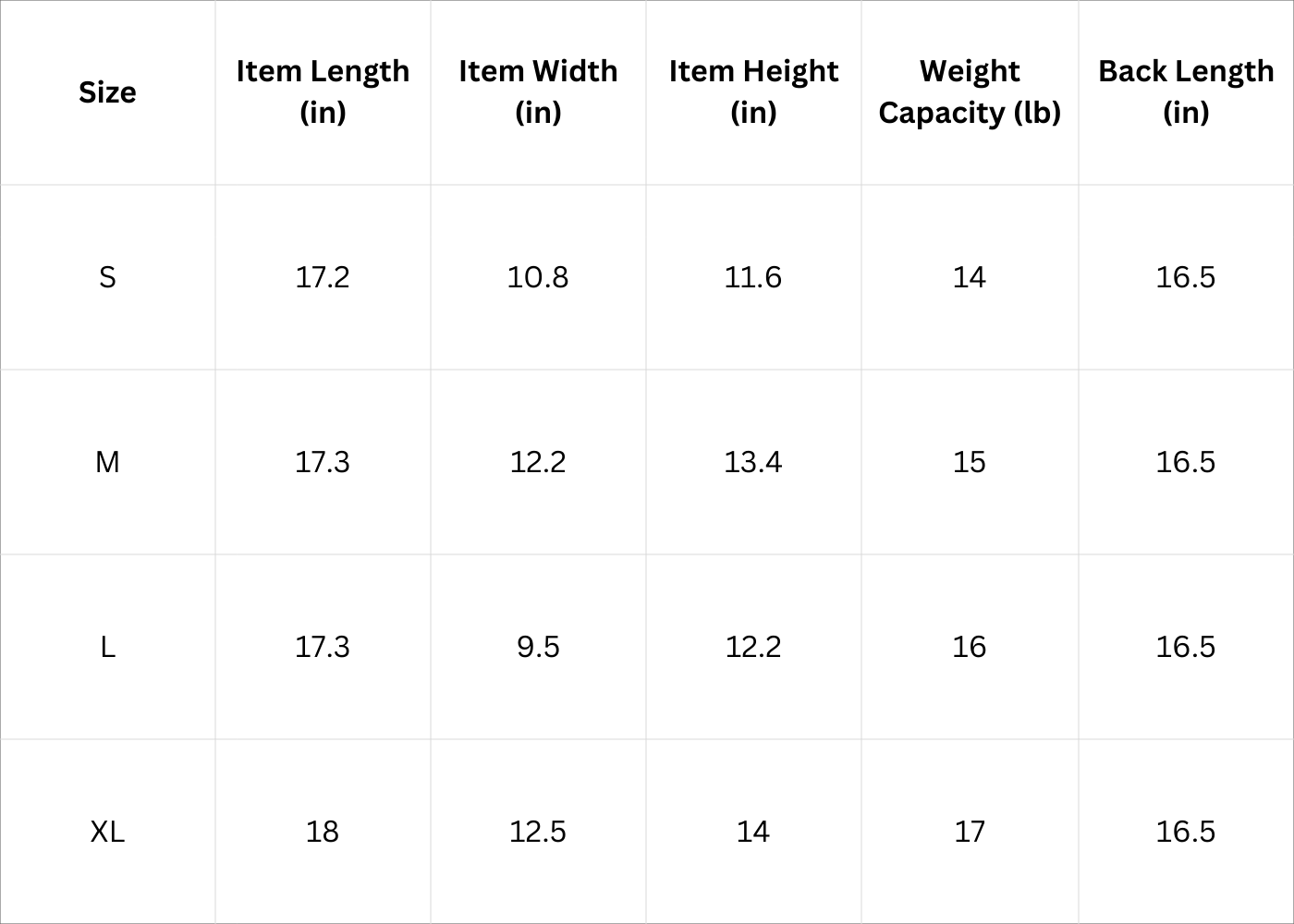 Size Chart (Inches):
